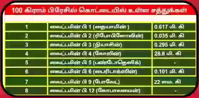 பிரேசில் கொட்டை 100 கிராமில் சுமார் 7.87 மி.கி. வைட்டமின் இ உள்ளது.